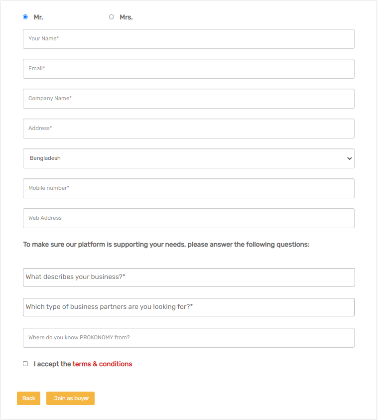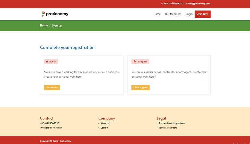 Register in Prokonomy System is easy. Go to www.prokonomy.com & click Join Now. The system will give you option to join as Buyer or Supplier. If you want to register as buyer, click I am a buyer, for supplier, I am a supplier.