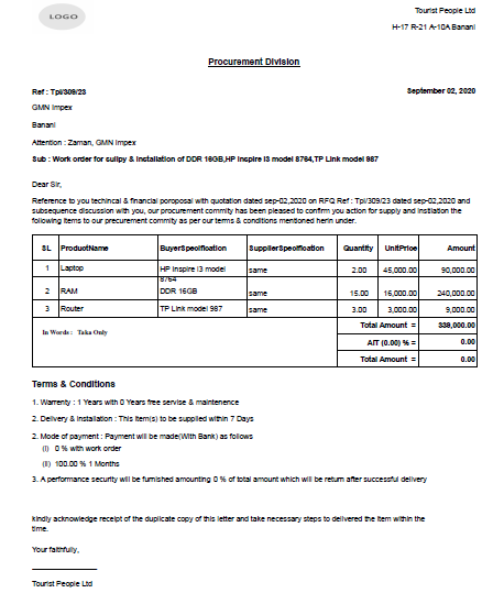 After submission of multiple quotations a buyer can generate quotation comparison statement. The system will generate CS Summary & Price CS. A Price CS based comparison will show the buyer only the rate provided by suppliers, from lowest to high and CS Summary will show overall evaluation based on all factors that include price, RFQ terms & conditions etc. A system generate algorithm will evaluate all the submitted quotation and generate the report. A default CS print format will give up to 10 suppliers price in a A4 paper in landscape format that shows CV value (RFQ Terms & Conditions Compliance Value) and price according to products.