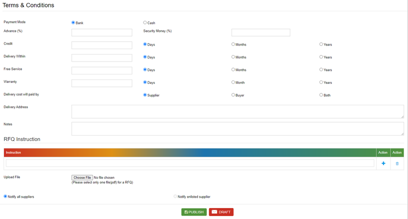 From a buyer profile by clicking RFQ a buyer can publish a new RFQ for matching supplier. The standard RFQ will have start and close date. The system will take the start date but closing date will be fixed by buyer. Suppliers will have obligation to submit any quotation after closing date, all the suppliers are bound to submit their quotation within this time frame. The new RFQ interface will guide a buyer step by step till to publish the RFQ. It needs to remember all the information given to a new RFQ only have relation to this RFQ, the system will handle separately for each RFQ. During product selection a buyer needs to select the product name from product group and mention the product model and other detail specifications in description. Set all other terms & conditions for supplier by selection. If a buyer wants to give some instruction such as submit some of legal papers or other instruction related to this RFQ can add as line one by one. If a buyer wants to give a supplier about the product any addition file which will help to supplier for product selection can upload file to this RFQ. Buyer have option to draft this RFQ or publish the RFQ. After publishing the RFQ system will trigger all matching suppliers that have option to get quotation. The buyer also can publish this RFQ to only its own supplier list by selecting notifies enlisted suppliers.